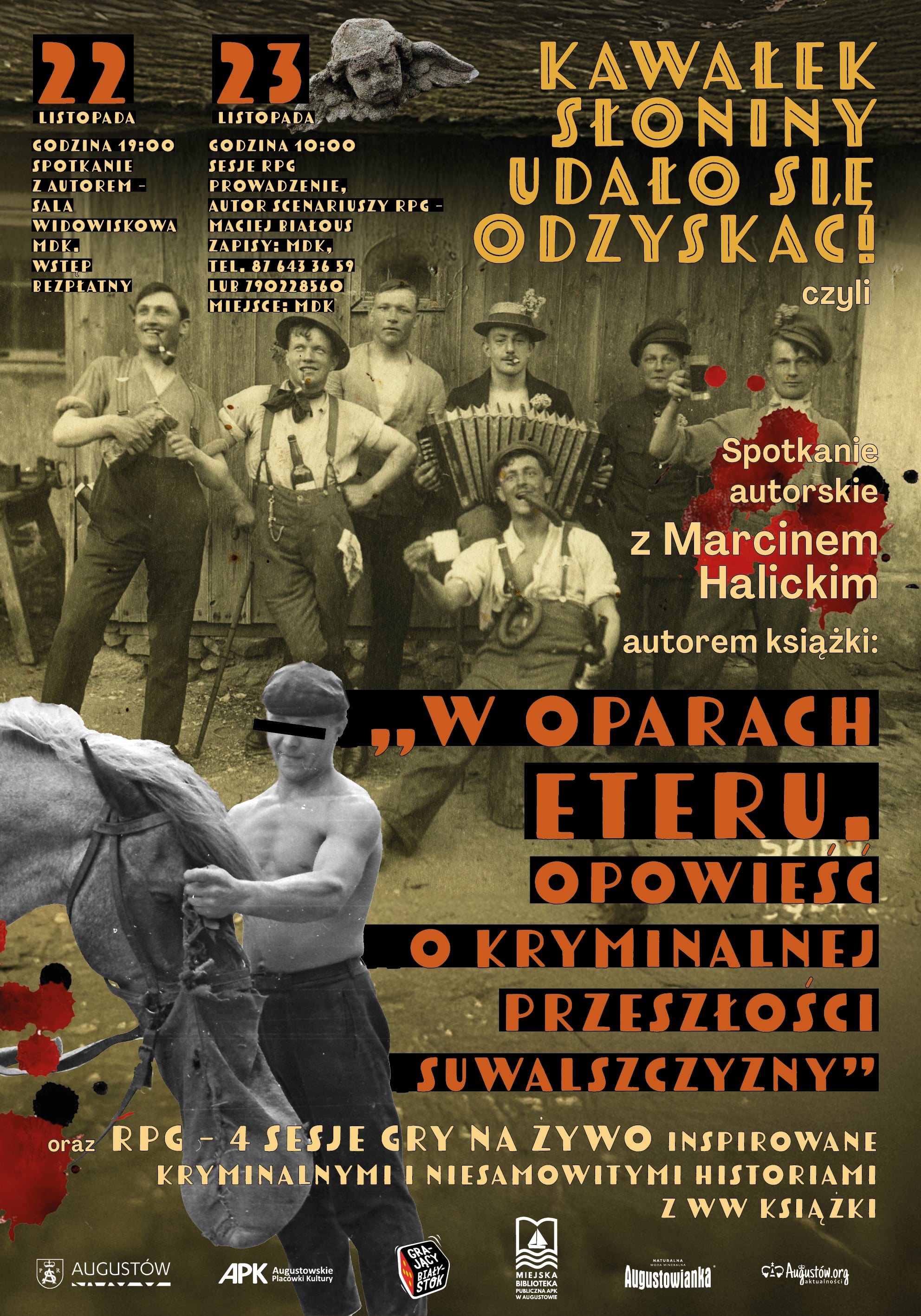 To nie koniec kryminalnych wrażeń w ten weekend, bo już w sobotę (23 listopada) od godz. 10:00 w naszym domu kultury – chyba po raz pierwszy – rozegramy sesje gry RPG opartej na wątkach zawartych w książce „W oparach eteru…” Marcina Halickiego. Zagrać może każdy powyżej 15 roku życia – ilość miejsc ograniczona, więc nie warto zwlekać z zapisami (tel. 87 643 36 59)