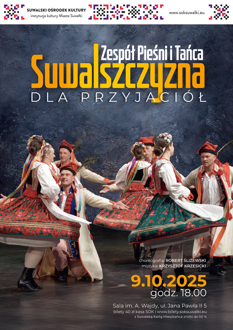 Zespół Pieśni i Tańca „Suwalszczyzna” serdecznie zaprasza na wyjątkowy Koncert dla Przyjaciół, który odbędzie się 9 października o godz. 18:00. Na scenie rozbrzmi barwny, pełen energii program – jesienny repertuar wypełniony radością, dynamiką i pięknym folklorem.