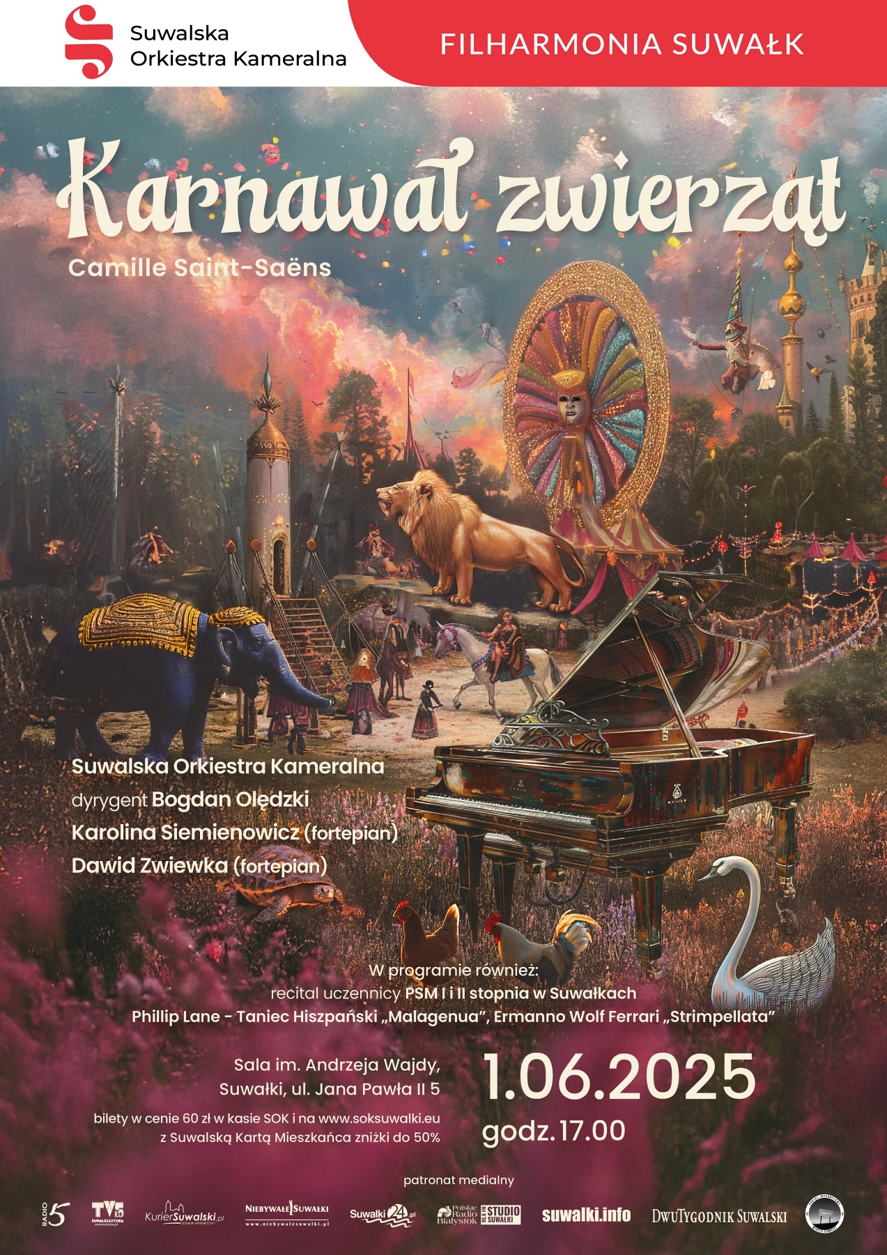 Już 1 czerwca 2025 r. na deskach Suwalskiego Ośrodka Kultury pojawi się nie lada gratka dla naszych młodych melomanów. Muzyczne Zoo w słynnym utworze „Karnawał Zwierząt" Camille Saint-Saën na dwa fortepiany zaprezentują Dawid Zwiewka oraz Karolina Siemienowicz, a towarzyszyć im będzie oczywiście Suwalska Orkiestra Kameralna pod dyrekcją Bogdana Olędzkiego.