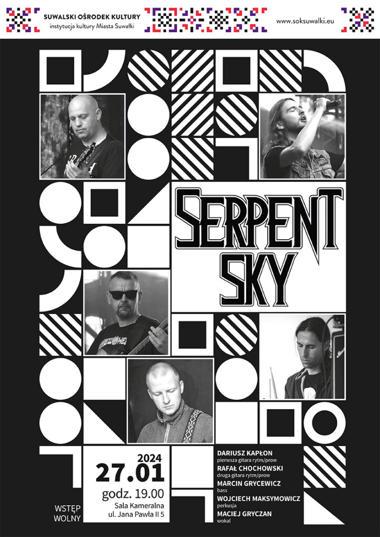 Serdecznie zapraszamy na wieczór z muzyką na żywo, czyli koncert zespołu Serpent Sky! Spotkanie muzyczne odbędzie się 27 stycznia w Sali Kameralnej SOK.