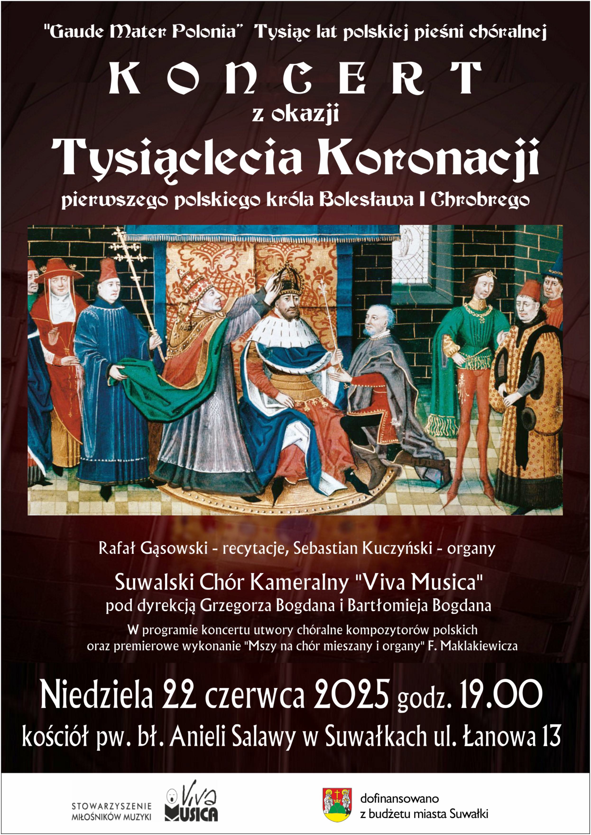 Stowarzyszenie Miłośników Muzyki "Viva Musica" zaprasza mieszkańców Suwałk oraz gości na koncert "Gaude Mater Polonia" z okazji 1000 lecia koronacji pierwszego króla Polski, który odbędzie się w najbliższą niedzielę 22 czerwca o godzinie 19.00 w kościele p.w. Błogosławionej Anieli Salawy w Suwałkach.