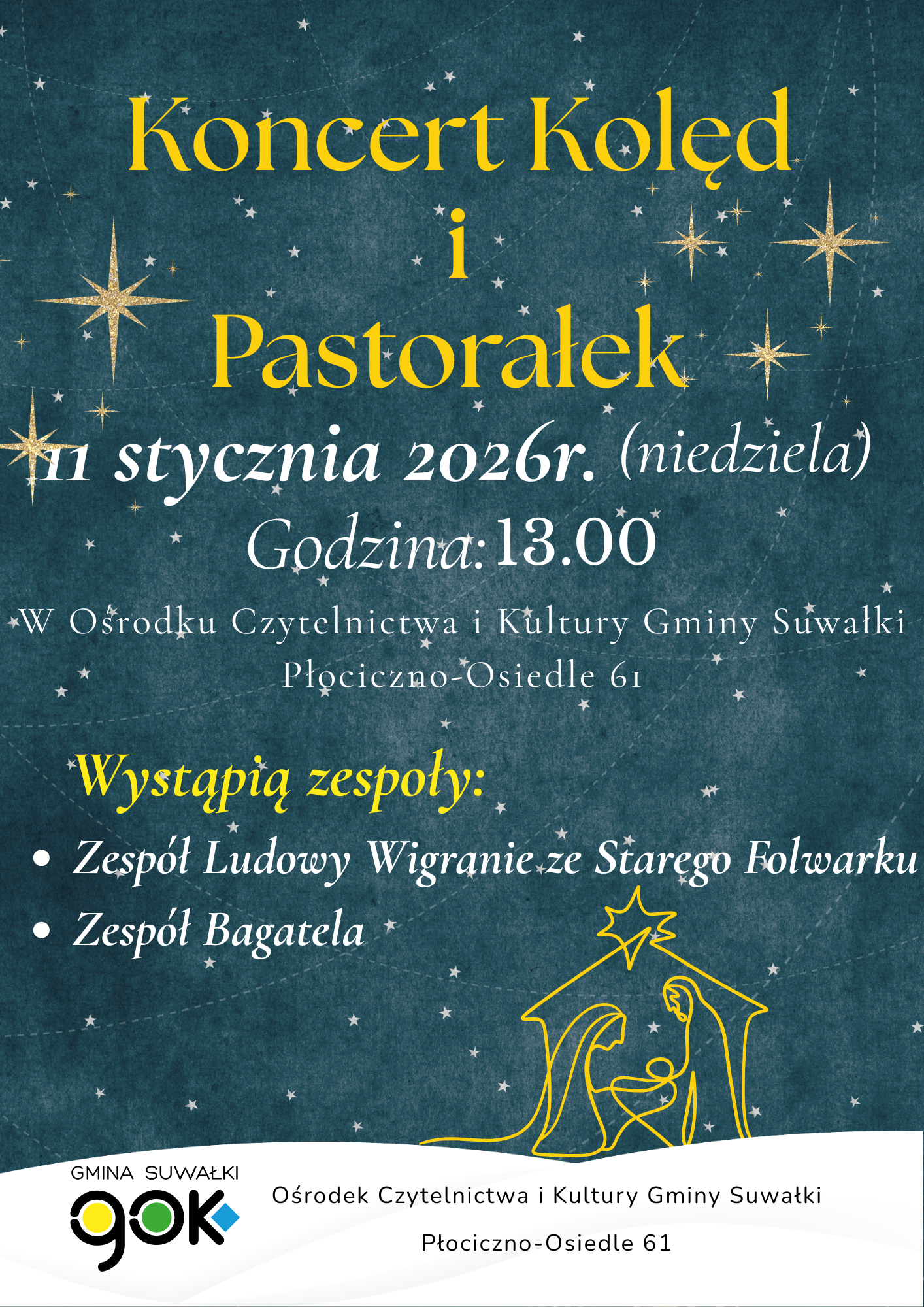 W niedzielę, 11 stycznia, w Ośrodku Czytelnictwa i Kultury Gminy Suwałki odbędzie się koncert Kolęd i Pastorałek, na który serdecznie zapraszamy.
