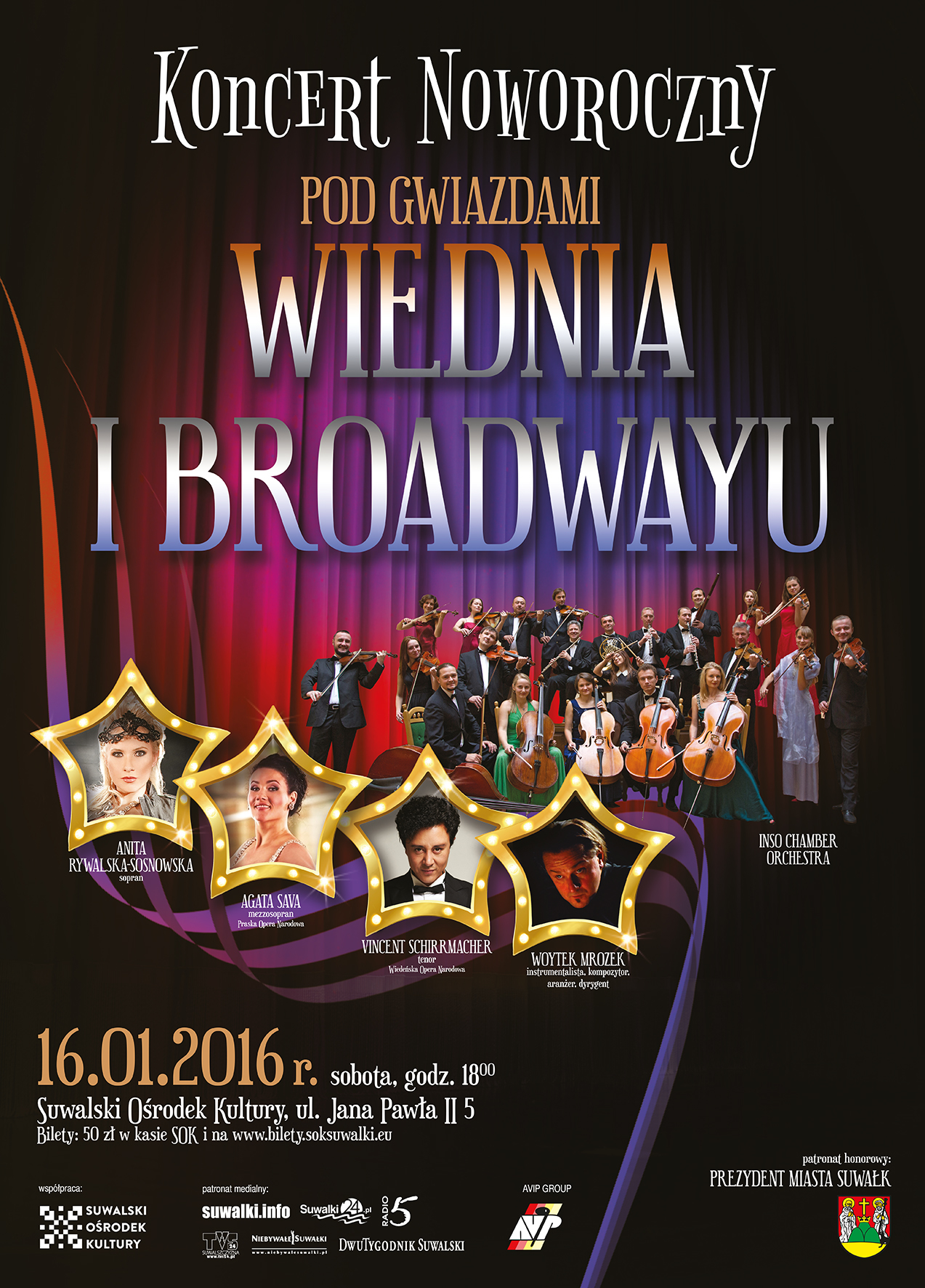 To prawdziwy koncert „bisów” w pigułce – usłyszymy arcydzieła muzyki w mistrzowskich interpretacjach. Największe przeboje operetki, opery i musicalu w wykonaniu znakomitych śpiewaków. Z towarzyszeniem INSO Chamber Ochestra zaśpiewają dla Państwa Anita Rywalska-Sosnowska – sopran, Agata Sava – mezzosopran (opera w Pradze) oraz Vincent Schirrmacher – ceniony tenor związany z operą wiedeńską. Całość poprowadzi maestro Woytek Mrozek, który wystąpi również w roli solisty (klarnet). Tym bardziej przyłączamy się do zaproszenia Prezydenta Miasta Suwałk Czesława Renkiewicza, który objął koncert honorowym patronatem.