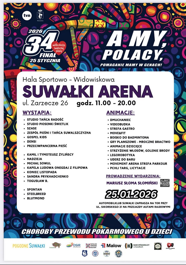 Suwalski sztab 34. Finału Wielkiej Orkiestry Świątecznej Pomocy zaprasza mieszkańców Suwałk i regionu do wspólnego grania i pomagania. Tegoroczna zbiórka prowadzona jest pod hasłem: „Zdrowe brzuszki naszych dzieci”
