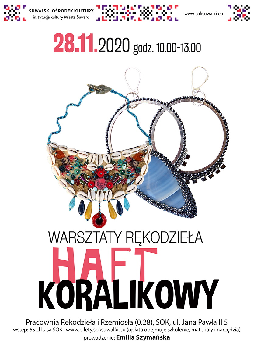 Podczas warsztatów uczestnicy, pod kierunkiem Emilii SzymaÅ„skiej, którÄ… tÄ… technikÄ… zajmuje siÄ™ już 7 lat, wykonajÄ… kolczyki wedÅ‚ug wÅ‚asnego projektu. Podczas warsztatów poznamy podstawy haftu koralikowego, wysokiej jakoÅ›ci materiaÅ‚y używane do wykonywania tej techniki, przykÅ‚ady prac wykonanych tÄ… technikÄ…, a uczestnicy spotkania wyjdÄ… z piÄ™knymi, wÅ‚asnorÄ™cznie uszytymi kolczykami-sztyftami.