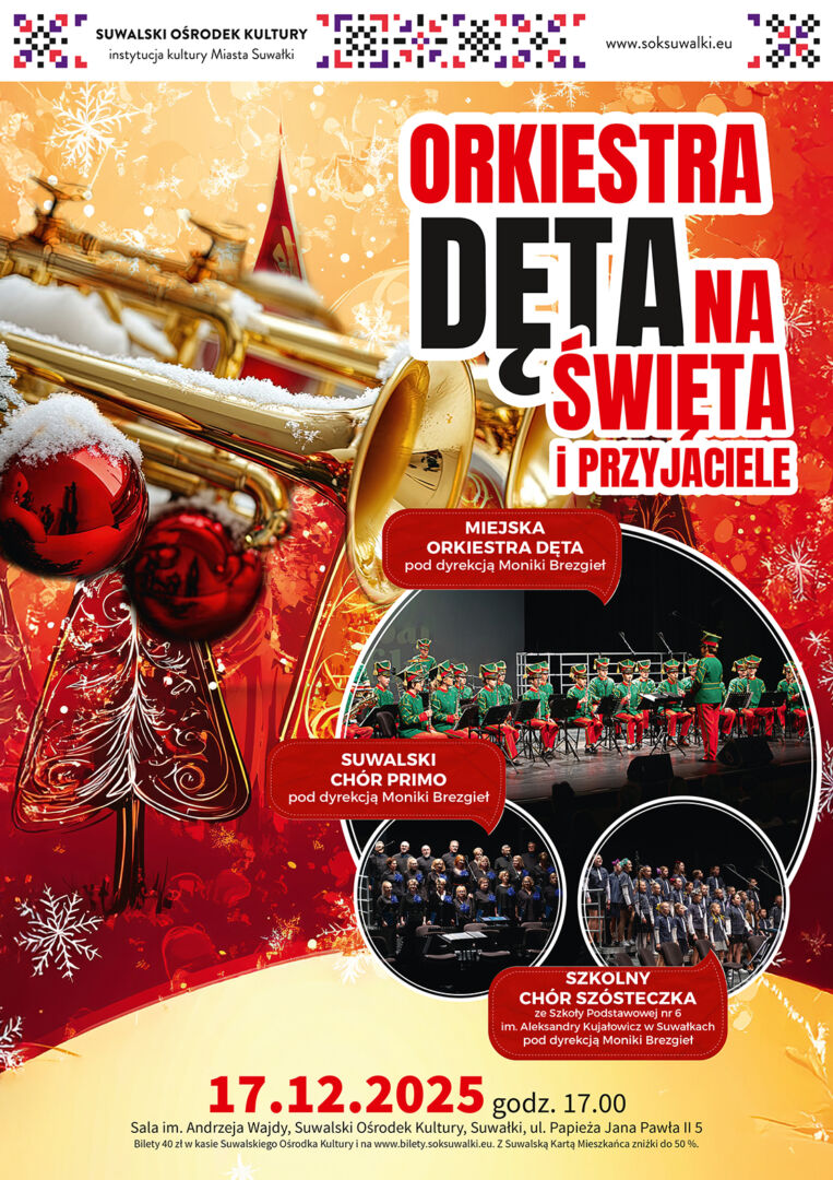 „Orkiestra Dęta na Święta i Przyjaciele" to wyjątkowy, pełen świątecznego nastroju koncert. W magiczną muzyczną atmosferę wprowadzą publiczność trzy zespoły, które połączą swoje siły, by wspólnie stworzyć niezapomniany, zimowy klimat. Na scenie zobaczymy Miejską Orkiestrę Dętą, Szkolny Chór "Szósteczka" oraz Suwalski Chór PRIMO.