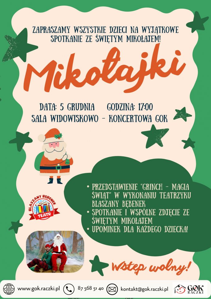 Gminny Ośrodek Kultury w Raczkach zaprasza wszystkie dzieciakina wyjątkowe Mikołajki z GOK. W programie przedstawienie ,,GRINCH- Magia Świąt '', wspólne zdjęcie z Świętym Mikołajem i upominek niespodzianka.