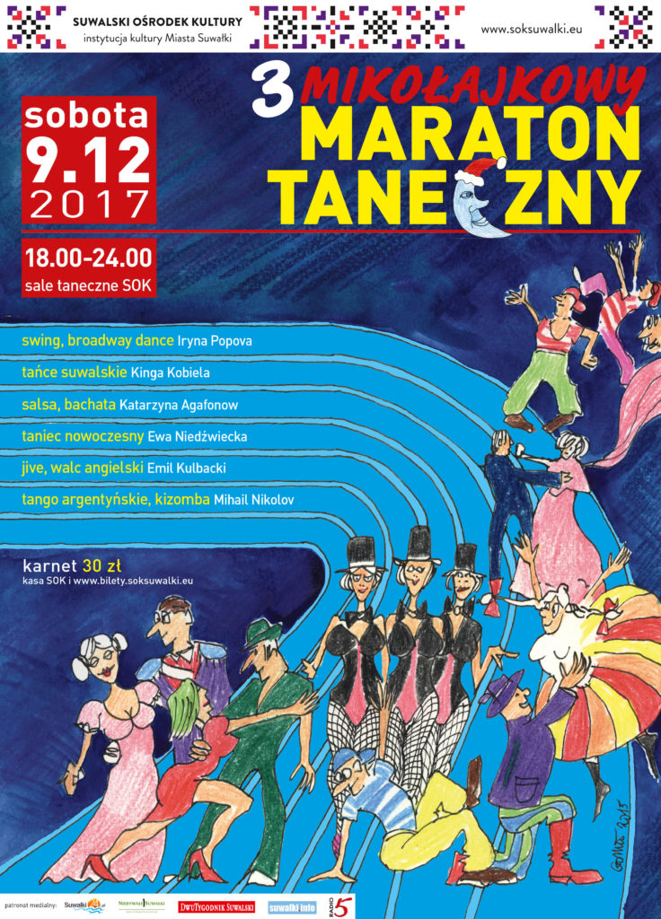 Sześć roztańczonych godzin, sześcioro instruktorów-mistrzów kroków do muzyki i aż 10 tańców. Mikołajkowy Maraton Taneczny rozpali 9 grudnia parkiety w salach tanecznych Suwalskiego Ośrodka Kultury. Do tańca zapraszają: Katarzyna Agafonow, Kinga Kobiela, Ewa Niedźwiecka, Iryna Popova, Emil Kulbacki i Mihaił Nikolov.