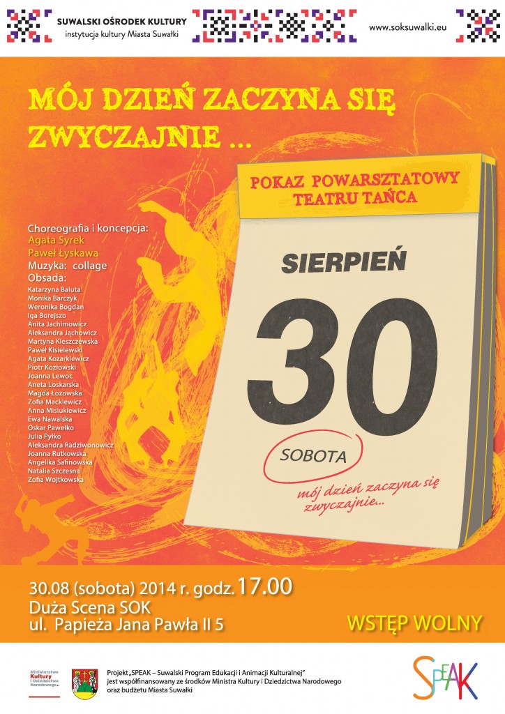 Ruchowa odsłona projektu SPEAK stała się dla suwalskiej młodzieży okazją do spotkania nie tylko z krakowskimi twórcami, ale także z nowym gatunkiem – teatrem tańca. Było to spotkanie niezwykłe. Pozwaliło bowiem na wzbogacenie dotychczasowego doświadczenia, opartego przede wszystkim na różnych gatunkach tańca nowoczesnego. Młodzież w pracy z Agatą Syrek i Pawłem Łyskawą, tancerzami Krakowskiego Teatru Tańca zdobywała nowe narzędzia, które pozwolą im w pełniejszy sposób wyrażać siebie w kolejnych artystycznych działaniach.