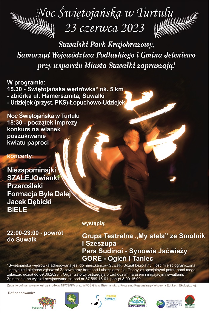 Suwalski Park Krajobrazowy, Samorząd Województwa Podlaskiego, Gmina Jeleniewo przy wsparciu Miasta Suwałki mają przyjemność zaprosić na Noc Świętojańską w Turtulu, która odbędzie się 23. czerwca 2023 roku o godzinie 18:30.