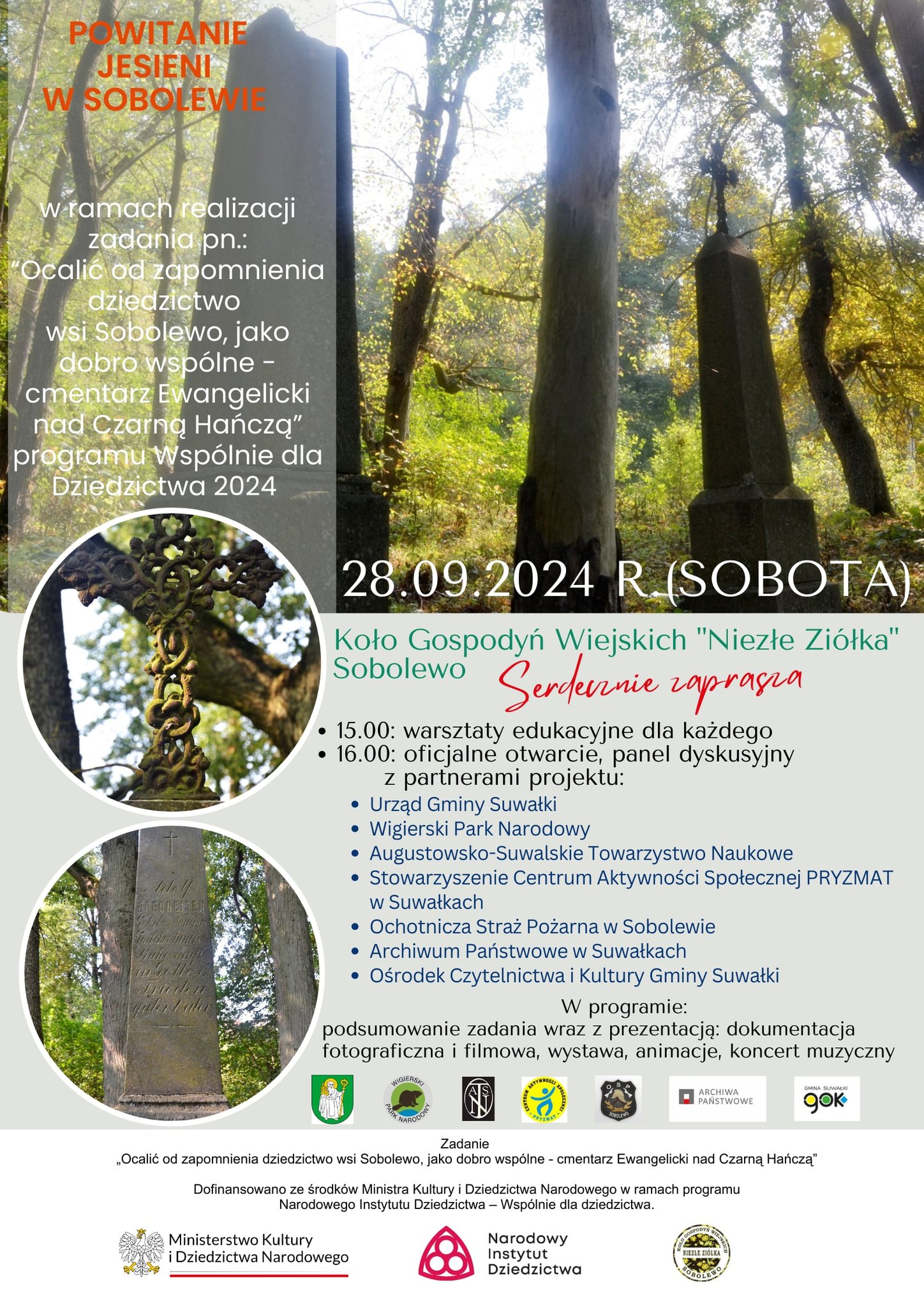 Powitanie jesieni organizuje Koło Gospodyń Wiejskich: KGW ,,Niezłe Ziółka" z Sobolewa. To wydarzenie podsumowujące realizację zadania pod nazwą: „Ocalić od zapomnienia dziedzictwo wsi Sobolewo, jako dobro wspólne - cmentarz Ewangelicki nad Czarną Hańczą”, z programu Wspólnie dla Dziedzictwa 2024.