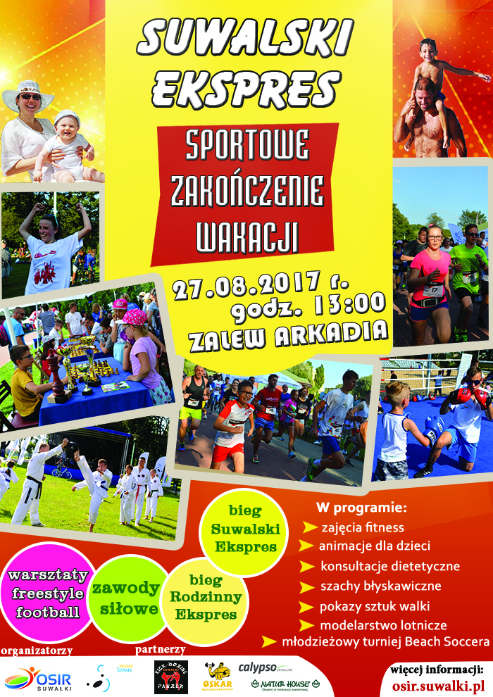 Na pożegnanie lata już po raz  trzeci Ośrodek Sportu i Rekreacji w Suwałkach przygotował sportową propozycję dla każdego. W ostatnią niedzielę wakacji, 27 sierpnia nad Zalewem Arkadia od godziny 13:00 odbędzie się blok imprez sportowo rekreacyjnych, podczas którego zaprezentują się suwalskie kluby sportowe oraz fitness. Na sympatyków piłki nożnej będzie czekała wyjątkowa niespodzianka – warsztaty tricków piłkarskich w wykonaniu Pawła Skóry – Mistrza Świata, Mistrza Europy i Mistrz Polski we freestyle football.