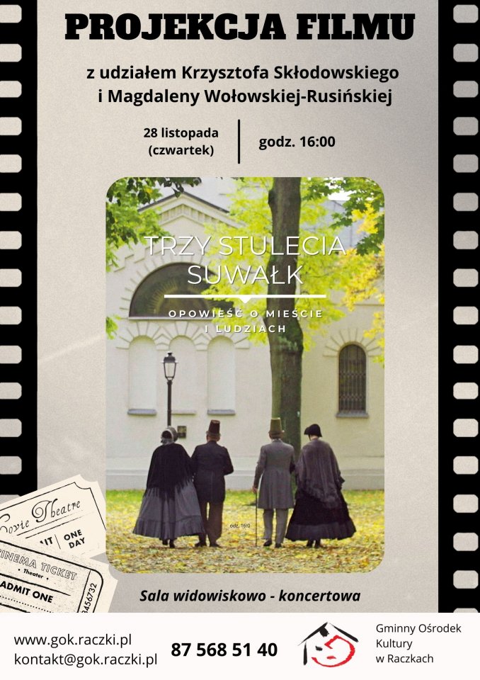 Gminny Ośrodek Kultury w Raczkach serdecznie zaprasza w najbliższy czwartek na projekcję filmu: "Trzy stulecia Suwałk" z udziałem autorów scenariusza, a zarazem aktorów filmu- Magdaleny Wołowskiej-Rusińskiej i Krzysztofa Skłodowskiego.