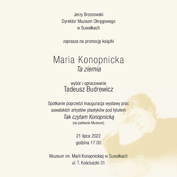 Jerzy Brzozowski, dyrektor Muzeum Okręgowego w Suwałkach zaprasza na promocję książki Maria Konopnicka "Ta ziemia" wybór i opracowanie Tadeusz Budrewicz.