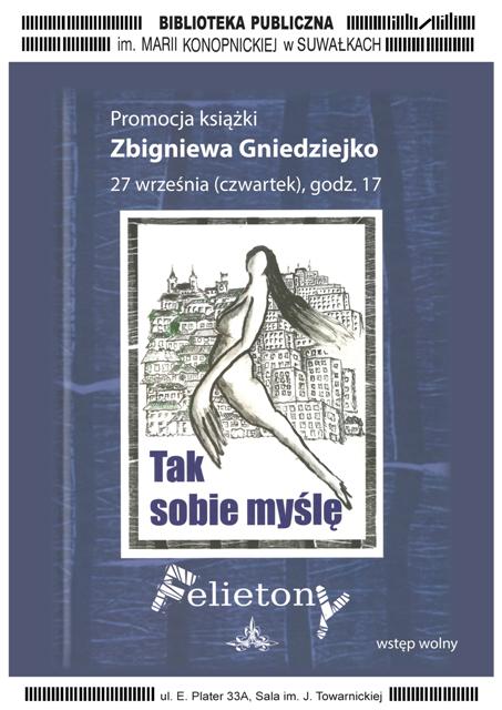 Biblioteka Publiczna im. Marii Konopnickiej w Suwałkach zaprasza na promocję książki "Tak sobie myślę" i spotkanie z autorem, Zbigniewem Gniedziejko, w czwartek 27 września 2018 r. o godz. 17:00, ul. E. Plater 33A, Sala im. J. Towarnickiej.