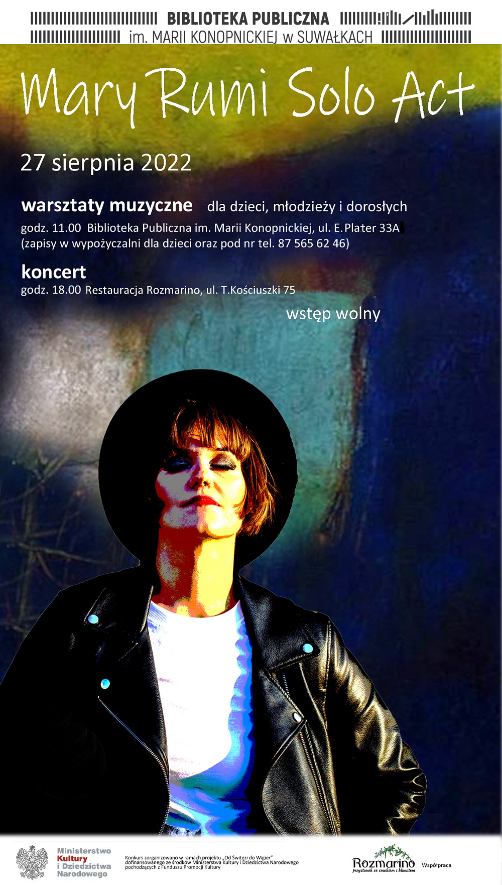 Biblioteka Publiczna im. Marii Konopnickiej zaprasza w sobotę 27 sierpnia o godzinie 18:00 do Restauracji Rozmarino na wyjątkowy recital Mary Rumi inspirowany "Balladami i Romansami" Adama Mickiewicza. Wstęp wolny.