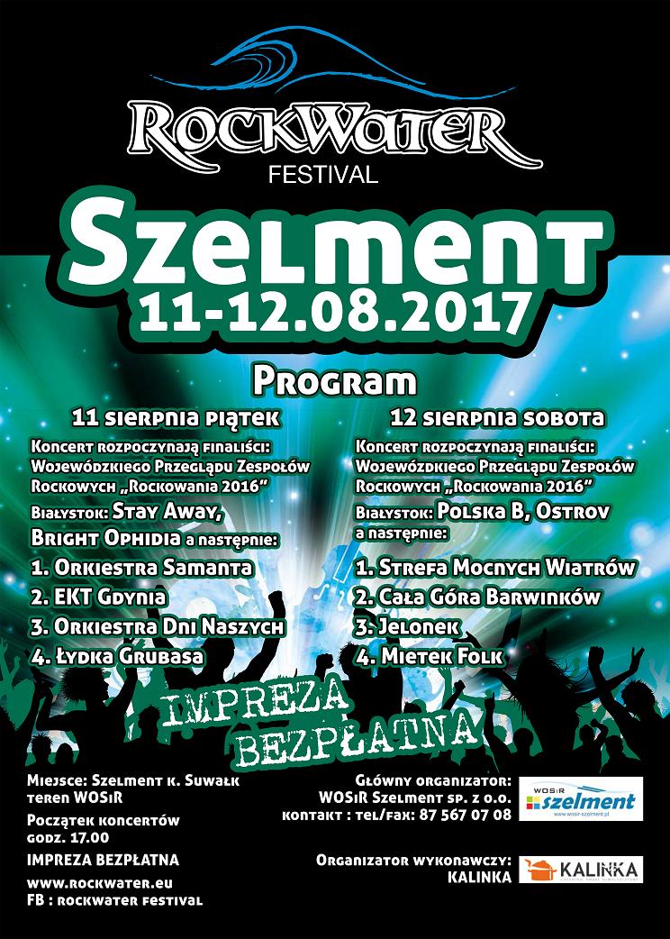 Wojewódzki Ośrodek Sportu i rekreacji w Szelmencie zaprasza na kolejną edycję Rock Water Festival. Festiwal odbędzie się w piątek i sobotę 11 sierpnia i 12 sierpnia. Koncerty będą rozpoczynać finaliści Wojewódzkiego Przeglądu Zespołów Rockowych „Rockowania 2016”. Pierwszego dnia wystąpią Stay Away oraz Bright Ophidia, a także Orkiestra Samanta, EKT Gdynia, Orkiestra Dni Naszych oraz Łydka Grubasa.