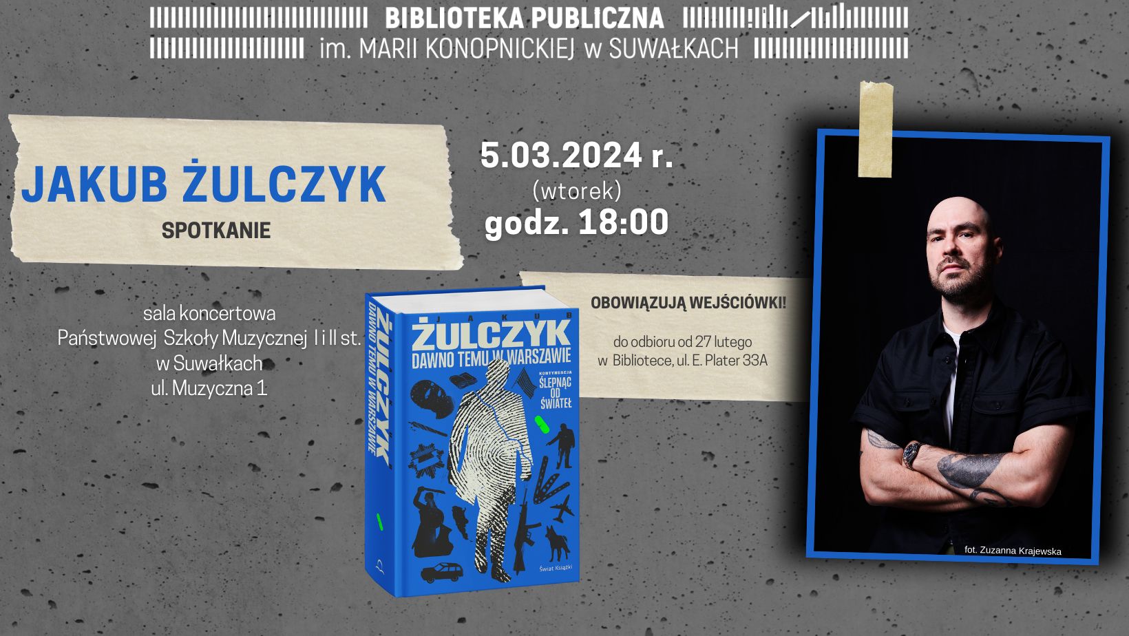 Biblioteka Publiczna im. Marii Konopnickiej w Suwałkach zaprasza na wyjątkowe wydarzenie – spotkanie z Jakubem Żulczykiem! Spotkanie odbędzie się 5 marca o godz. 18.00 w sali koncertowej Państwowej Szkoły Muzycznej I i II stopnia w Suwałkach ul. Muzyczna 1. Obowiązują wejściówki!