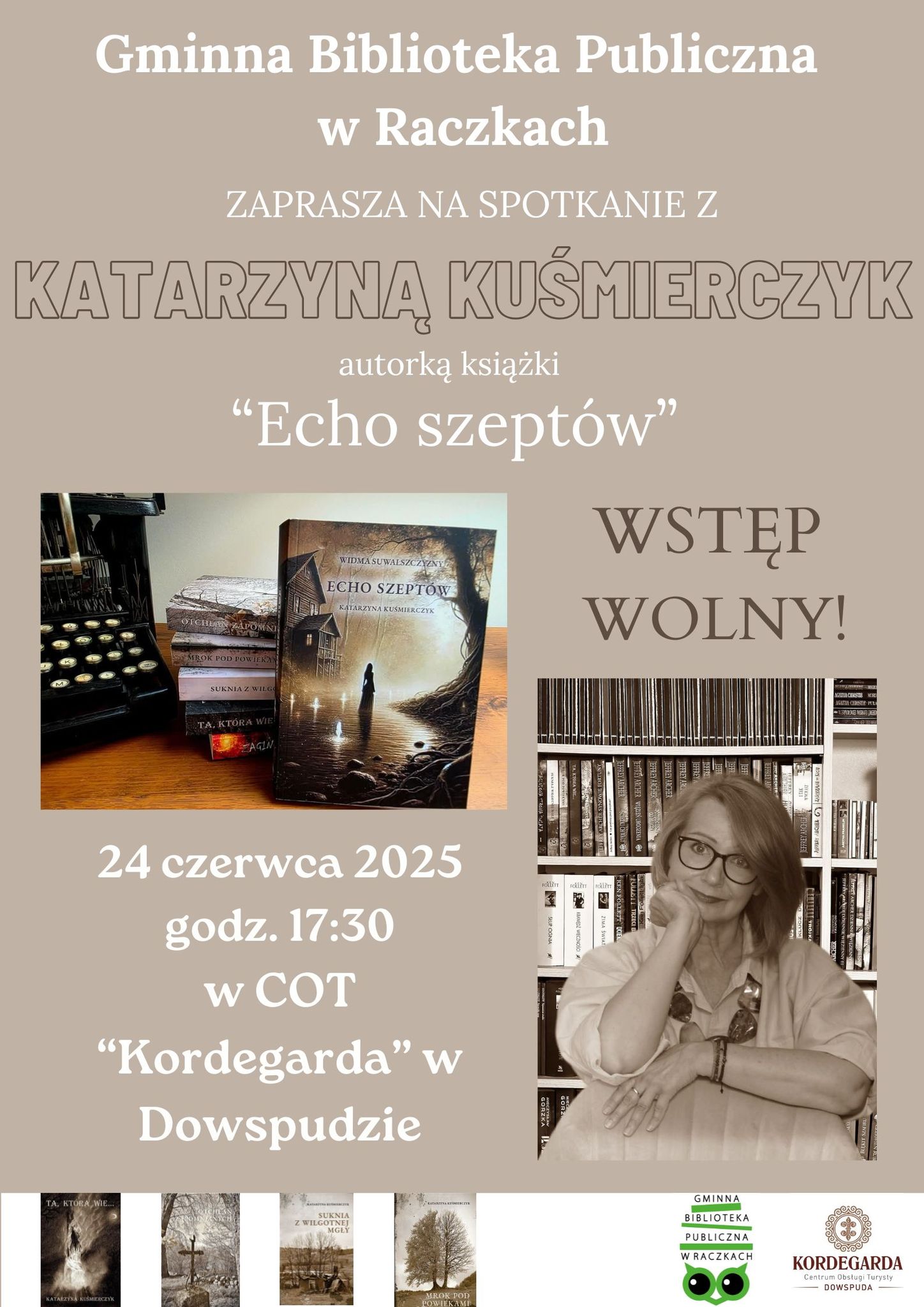 Gminna Biblioteka Publiczna w Raczkach zaprasza na spotkanie z Katarzyną Kuśmierczyk, autorką książek: "Suknia z wilgotnej mgły", "Mrok pod powiekami", "Otchłań zapomnianych", "Ta, która wie".