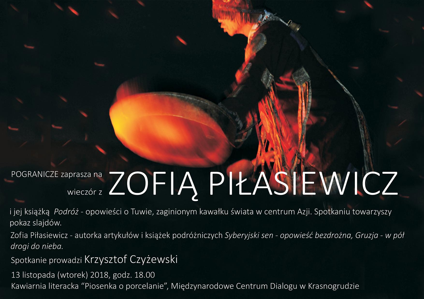 Pogranicze zaprasza na spotkanie z ZOFIĄ PIŁASIEWICZ i jej książką "Podróż" - opowieścią o Tuwie, zaginionym kawałku świata w centrum Azji. Spotkaniu towarzyszyć będzie pokaz slajdów