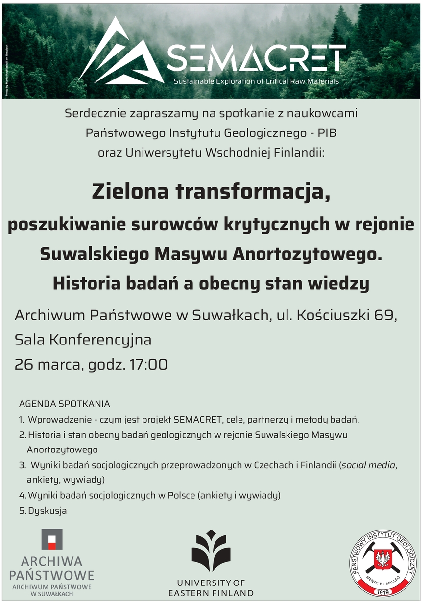 Spotkanie bÄ™dzie poÅ›wiÄ™cone projektowi SEMACRET, który koncentruje siÄ™ na zrównoważonym poszukiwaniu surowców krytycznych w rejonie Suwalskiego Masywu Anortozytowego. Uczestnicy wydarzenia bÄ™dÄ… mieli okazjÄ™ zapoznać siÄ™ z historiÄ… badaÅ„ geologicznych w tym regionie oraz bieżącym stanem wiedzy na temat zasobów surowców krytycznych.