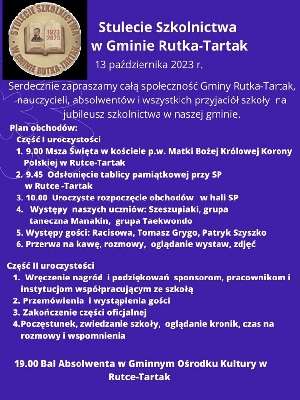 13 października odbędą się Obchody Stulecia Szkolnictwa w Gminie Rutka-Tartak. Z tej okazji Komitet organizacyjny serdecznie zaprasza całą społeczność Gminy, wszystkich nauczycieli i absolwentów na wspólne świętowanie. Obchody rozpoczną się o godz. 9.00 i trwać będą do godzin popołudniowych.