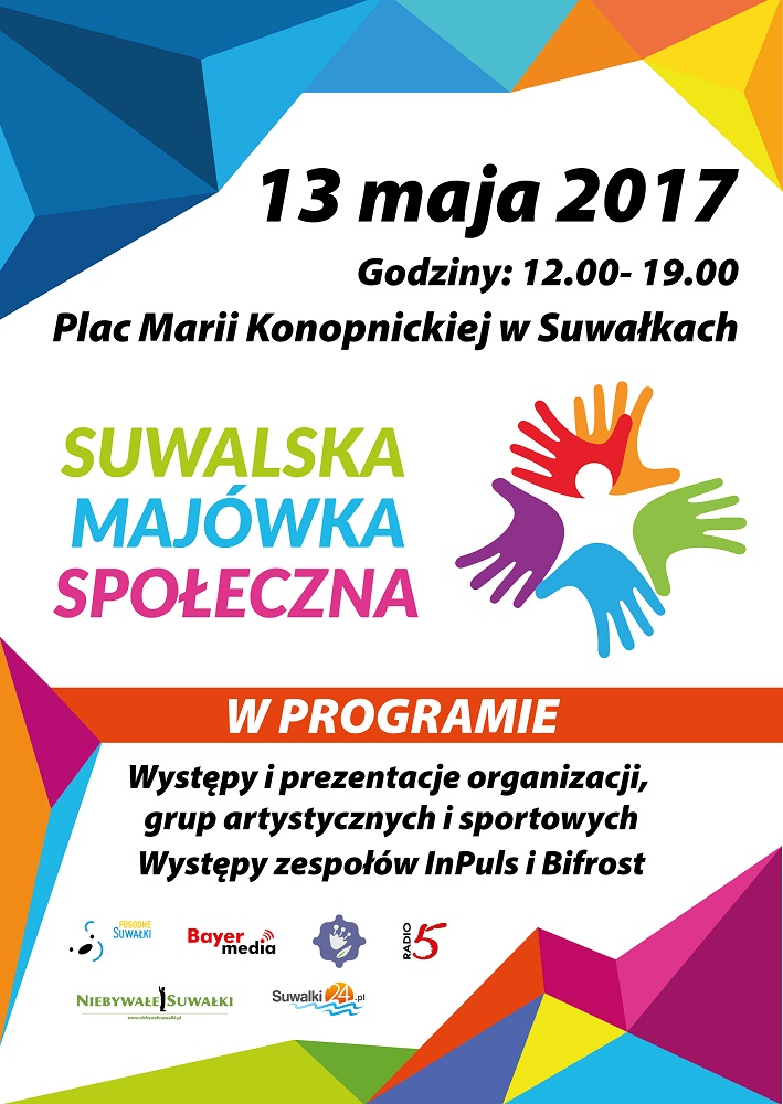 W sobotę 13 maja na Placu Marii Konopnickiej odbędzie się Suwalska Majówka Społeczna (SMS) organizacji pozarządowych. Celem wydarzenia jest promocja organizacji pozarządowych działających w Mieście Suwałki.