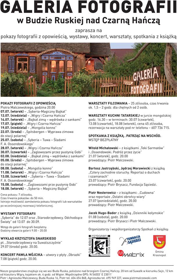 Organizatorzy i współorganizatorzy Spotkań z książką: Nasze gospodarstwo znajduje się we wsi Buda Ruska, położone nad brzegiem Czarnej Hańczy. 20 km od Suwałk w kierunku Sejn, 12 km od klasztoru Wigry, kajakiem ok. 4 godz. od Wigier. Współrzędne GPS: N 54003’ E 23011’ Piotr i Agnieszka Malczewscy, Buda Ruska 16, Piotr tel. 604 654 868, Agnieszka tel. 695 949 227, www.piotrmalczewski.com
