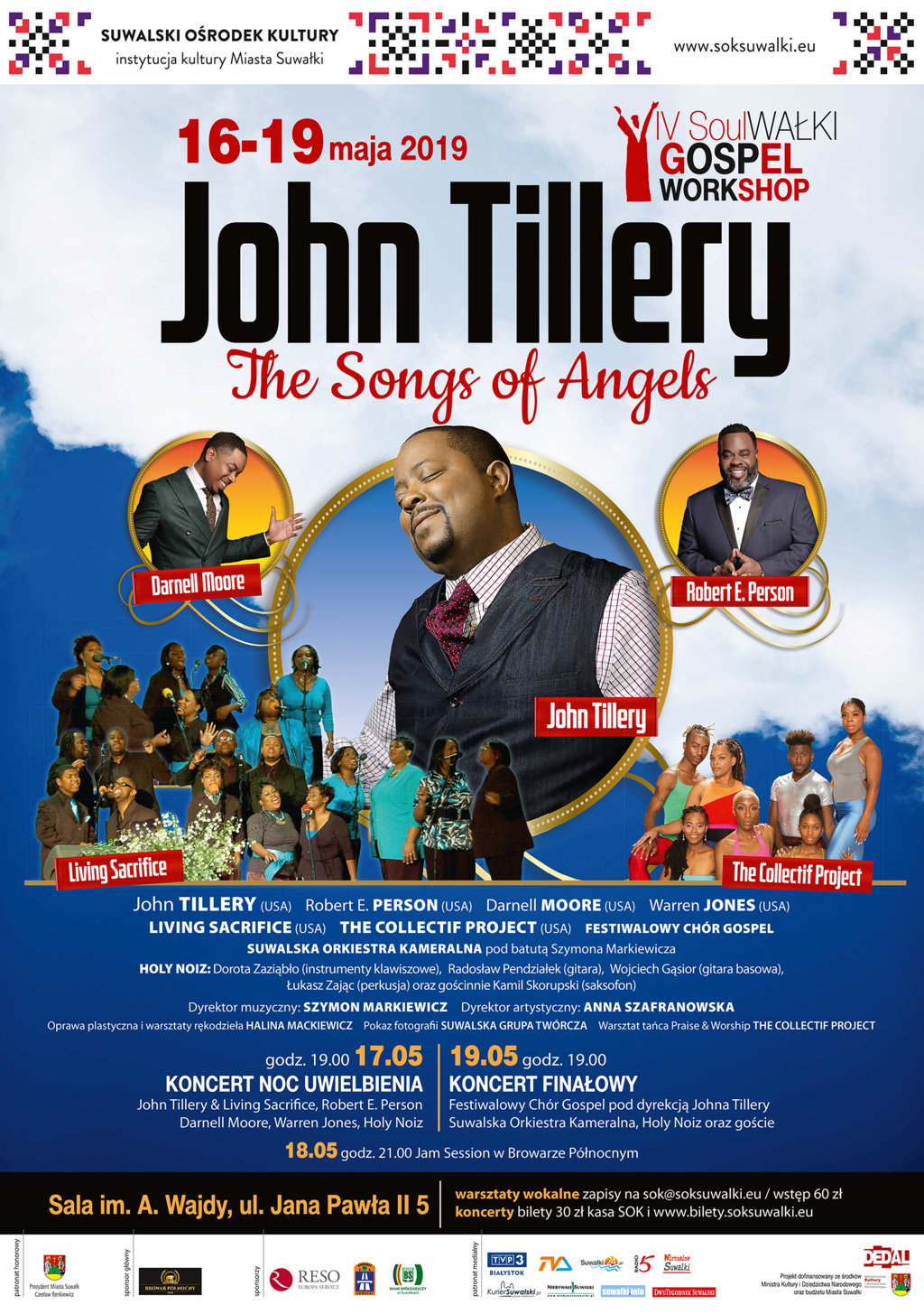 Koncerty, warsztaty, światowe gwiazdy Gospel & Jazz, czyli anielskie głosy i niebiańska muzyka ponownie w Suwałkach. Na scenie wspaniali artyści z USA – John Tillery & Living Sacrifice, ich goście specjalni: Robert E. Person, Darnell Moore, Warren Jones i The Collectif Project z USA oraz Holy Noiz, Suwalska Orkiestra Kameralna i Festiwalowy Chór Gospel.