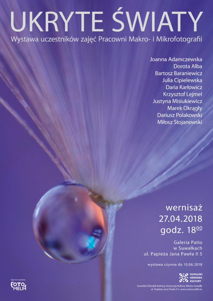Cząstkę świata niedostrzegalnego na co dzień zobaczymy na zachwycających zdjęciach uczestników zajęć Pracowni Makro- i Mikrofotografii Marka Misia prowadzonych w Suwalskim Ośrodku Kultury. Fotografie umożliwią nam odbycie podróży przez kształty i kolory płatków kwiatów, refleksy światła w szkle, czy chemiczne substancje – fascynujące ukryte światy.