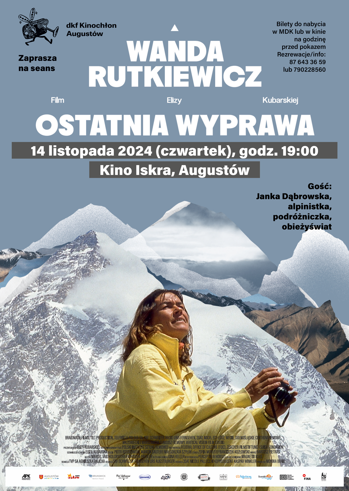 DKF KINOCHŁON zaprasza w czwartek 14 listopada 2024 o godz. 19:00 do augustowskiego kina Iskra (ul. 3 Maja 38) na seans dokumentalnego filmu o Wandzie Rutkiewicz. Filmu, o tyle nie zwykłego, że opowiedzianego głosem Wandy Rutkiewicz właśnie. Gościnią tego pokazu będzie Janka Dąbrowska – podróżniczka i alpinistka.