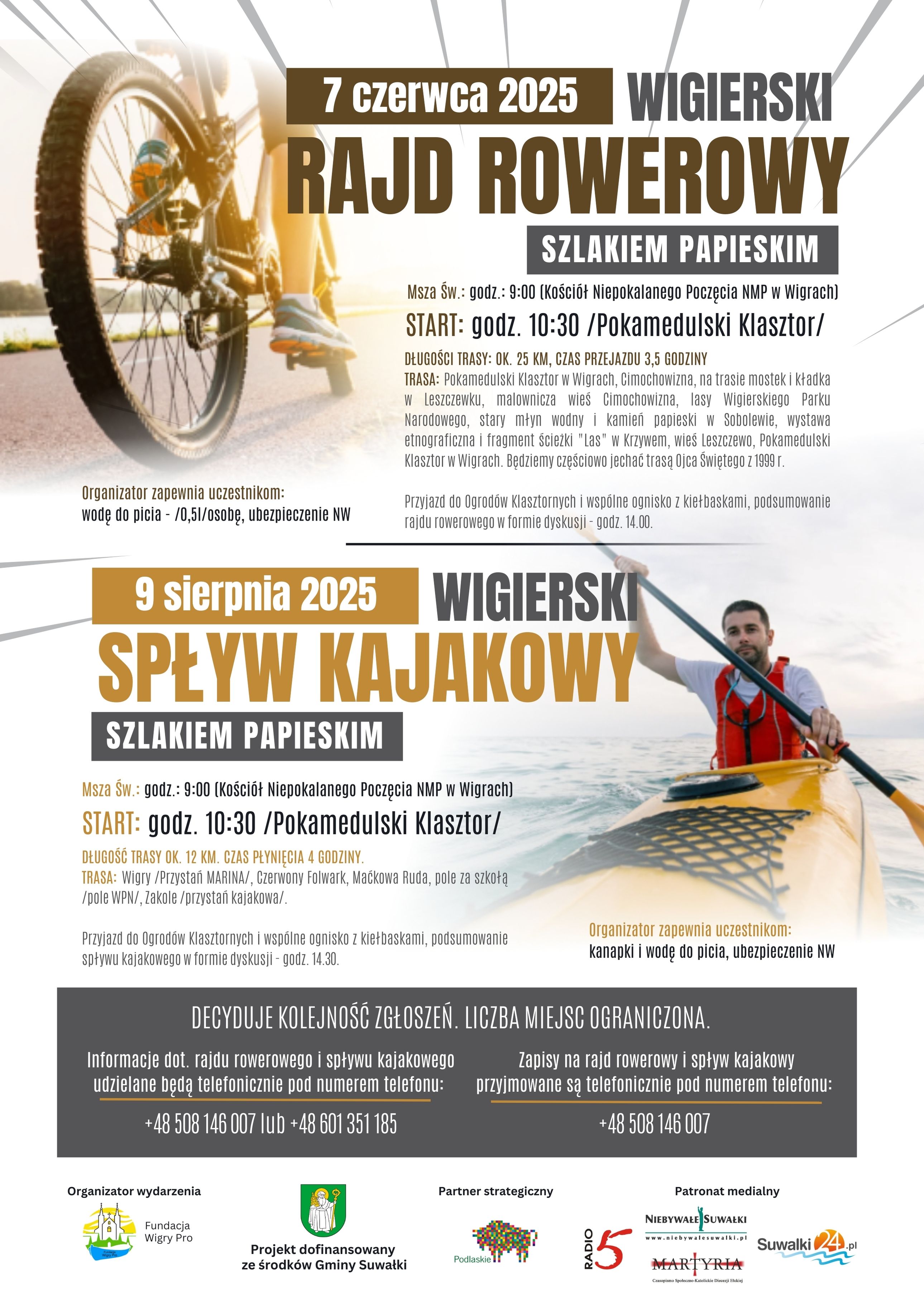 Fundacja Wigry Pro zaprasza serdecznie na Wigierski Rajd Rowerowy Szlakiem Papieskim, który odbędzie się 7 czerwca.