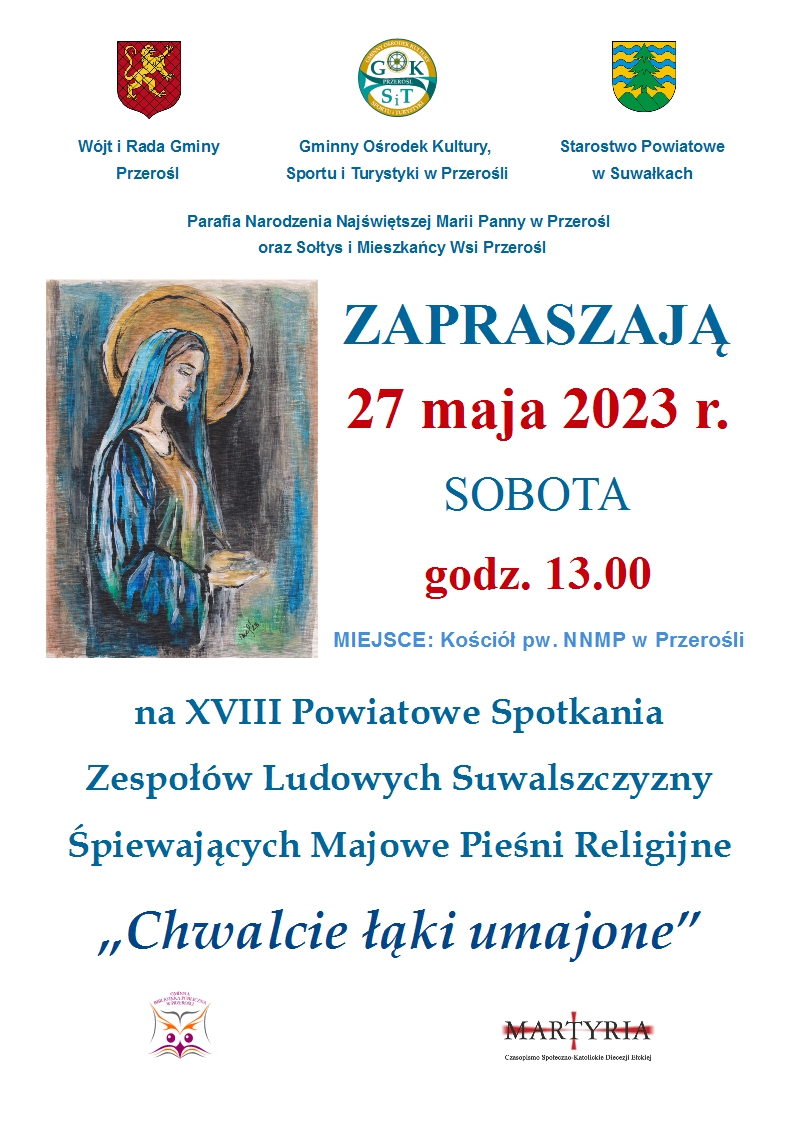 XVIII Powiatowe Spotkania Zespołów Ludowych Suwalszczyzny Śpiewających Majowe Pieśni Religijne „Chwalcie łąki umajone” odbędą się w sobotę, 27 maja, w Przerośli.