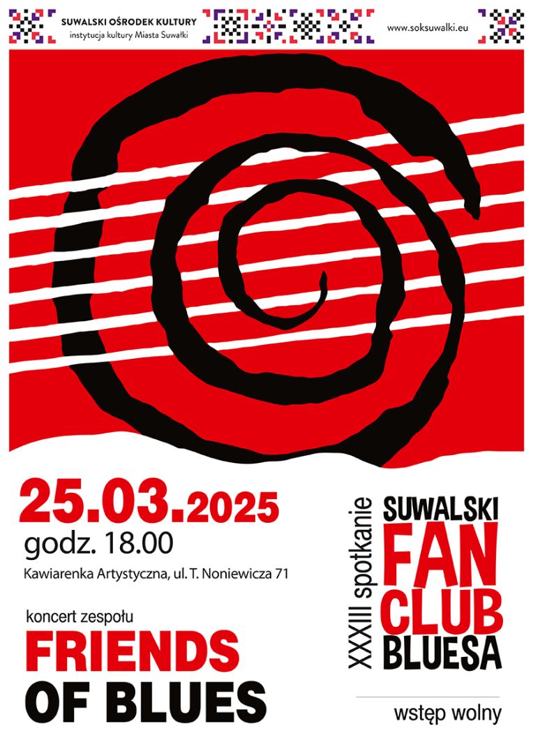Zapraszamy 25 marca 2025 r. do Kawiarenki Artystycznej, na scenie wystąpi zespół Friends of Blues w ramach XXXIII spotkania Suwalskiego Fan Clubu Bluesa.