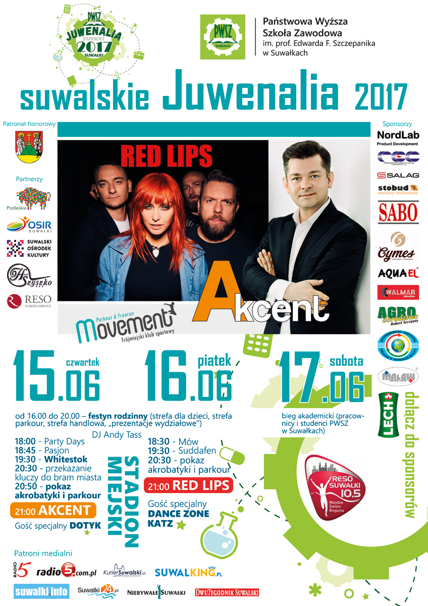 Takiego Święta Żaków w Suwałkach jeszcze nie było! 15 czerwca ruszają Juwenalia Państwowej Wyższej Szkoły Zawodowej w Suwałkach. Występy artystyczne, pokaz akrobatyki, strefy rodzinne, warsztaty parkour, stoiska handlowe, Bieg Akademicki oraz przede wszystkim koncerty gwiazd.