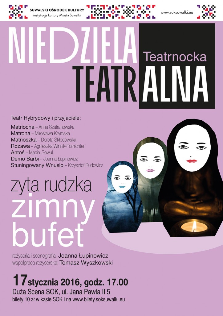 „Zimny Bufet” to nagrodzona Gdyńską Nagrodą Dramaturgiczną sztuka Zyty Rudzkiej to opowieść o rodzeństwie, Rdzawej i Antosiu, które spotyka się, by czuwać nad ciałem zmarłej matki, przez lata chorującej na Alzheimera. Razem przechodzą kolejne etapy „czynności pogrzebowych”, jak mycie ciała, wybieranie ubrania i ubieranie ciała do trumny. Dramatyczna sytuacja rozpisana jest na wiele głosów. Dotknięty chorobą umysł kobiety rozpada się na trzy postaci: Matrionę, Matriochę i Matrioszkę, symbolizujące okresy ludzkiego życia. Zmarła matka rozmawia ze swoimi dziećmi, próbując niejako pomóc im w odbyciu żałoby. Dorosłe już dzieci nie potrafią poradzić sobie z pamięcią o matce. Zmagając się na własną rękę z emocjonalnym obciążeniem, ale też własnymi demonami, same poddają się „czynnościom pogrzebowym”, które mają im pomóc uporać się ze śmiercią najbliższej osoby.