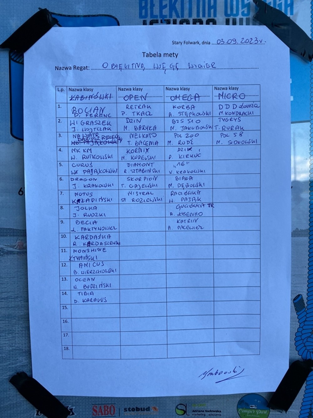 Sternik Maciej Kondracki w jachcie DDD Łomża zwyciężył w klasie Mikro. Pierwsze miejsce w klasyfikacji Jachtów Kabinowych zajęła załoga Bociana ze sternikiem Dariuszem Ferencem.