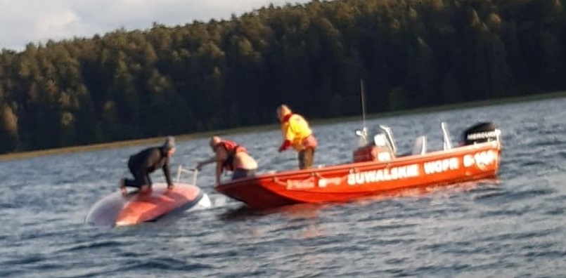 W niedzielę, 22 września o godz. 16.30 ratownik dyżurny Suwalskiego WOPR w Bazie CKRW w Starym Folwarku odebrał zgłoszenie o wywróconej kabinowej łodzi żaglowej na jeziorze Wigry na wysokości Rosochatego Rogu.