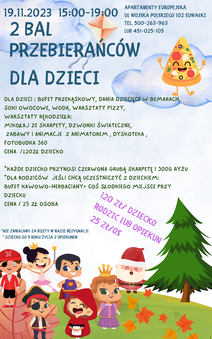 Na drugą już edycję Balu Przebierańców wszystkie dzieci zapraszają Apartamenty Europejska przy ul. Wojska Polskiego w Suwałkach. Impreza odbędzie się 19 listopada (niedziela) w godz. 15:00 - 19:00.