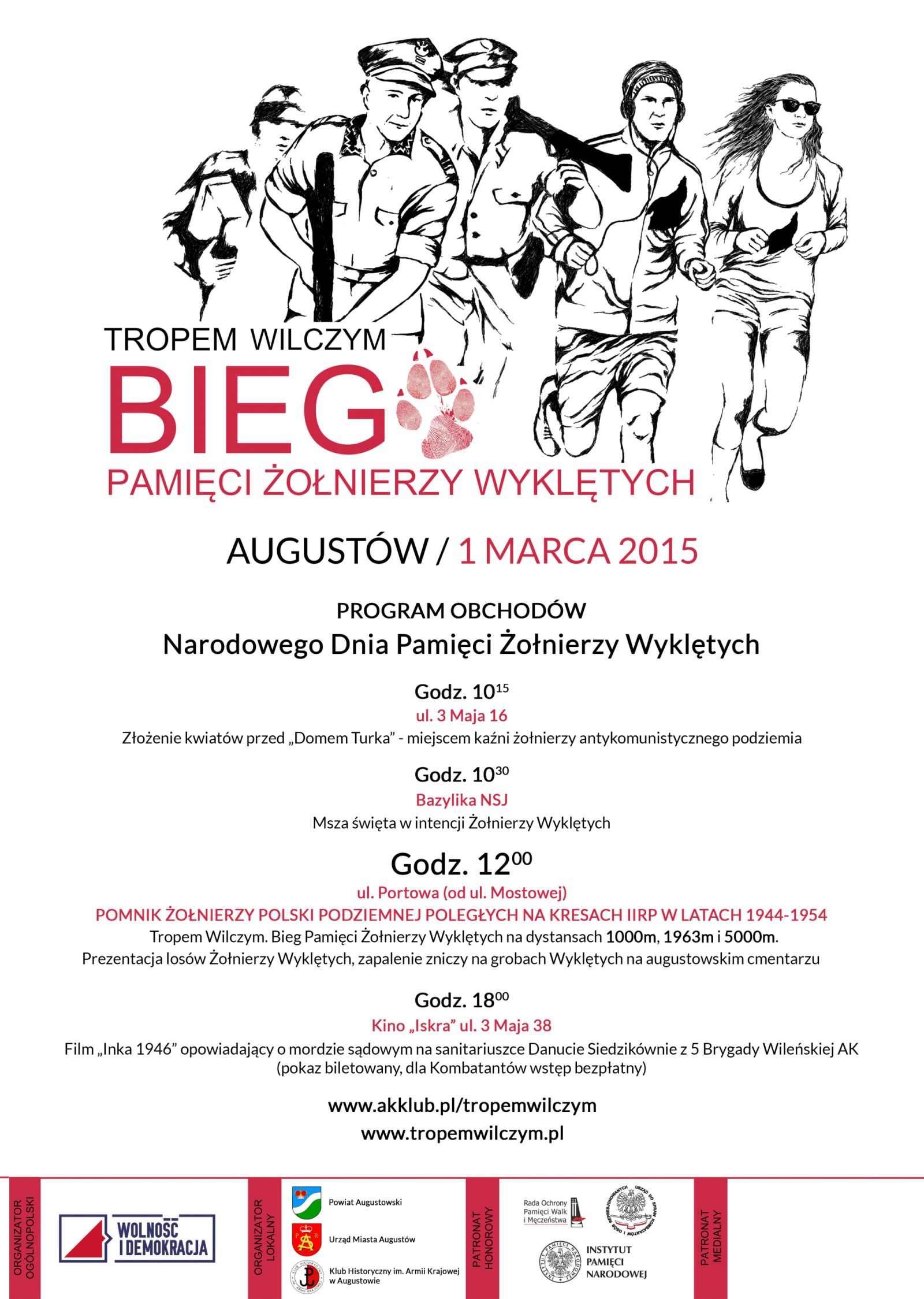 Głównym punktem zaplanowanych na 1 marca tegorocznych augustowskich obchodów Narodowego Dnia Pamięci Żołnierzy Wyklętych będzie bieg „Tropem Wilczym. Bieg Pamięci Żołnierzy Wyklętych” na trzech dystansach: 1.000 metrów, 5.000 metrów oraz 1963 metrów. Ten ostatni dystans symbolizuje datę zabicia ostatniego z Wyklętych.