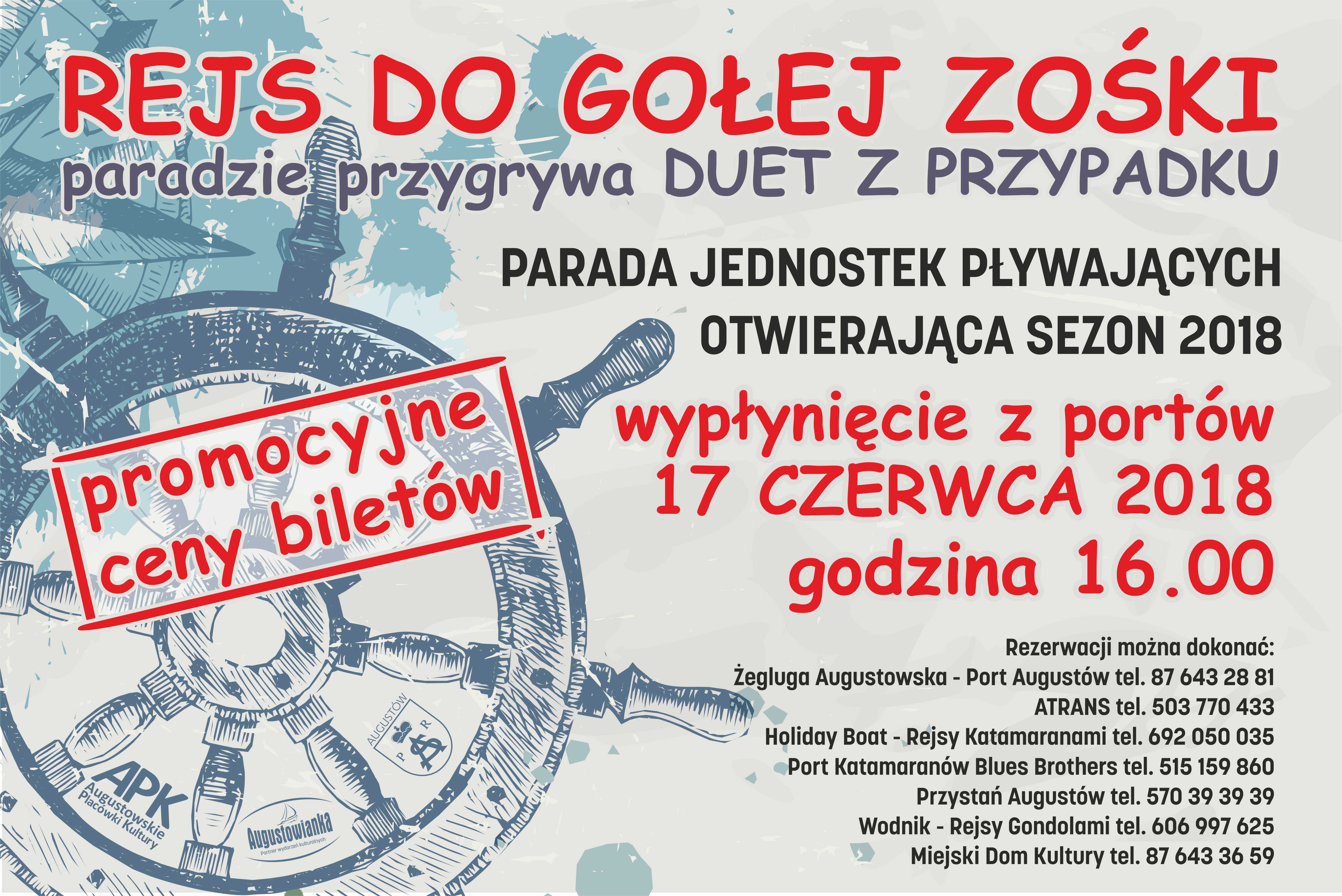 Augustowskie Placówki Kultury zapraszajÄ… do rezerwacji i zakupu biletów na statek, na pokÅ‚adzie którego wystÄ…pi – przygrywajÄ…cy caÅ‚ej paradzie – Duet z Przypadku, w skÅ‚adzie Dorota Bujnowska i Emil Kulbacki. Start z portu Å»eglugi Augustowskiej o 16:00 – bilety w cenie 20 zÅ‚ do nabycia w Miejskim Domu Kultury przy Rynku Zygmunta Augusta 9, tel. 87 643 36 59.