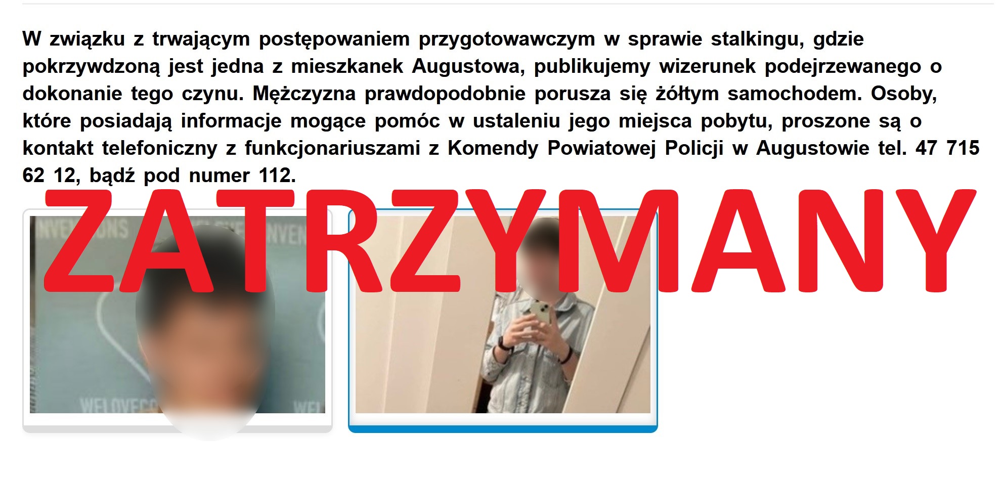 Mężczyzna podejrzewany o stalking, którego ofiarą padła jedna z mieszkanek Augustowa, został zatrzymany. Taką informację podała dziś rano augustowska Policja.