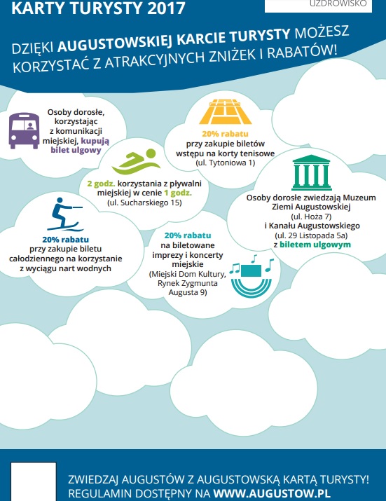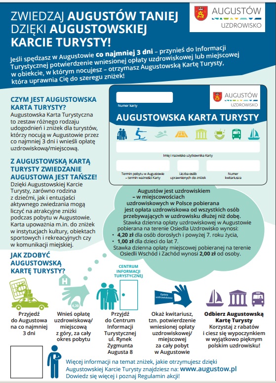 Augustowska Karta Turysty to oferta zniżek i rabatów na przejazdy komunikacją miejską, gastronomię, atrakcje, muzea, korzystanie z obiektów sportowych i rekreacyjnych, imprezy kulturalne, itd. na terenie Gminy Miasta Augustów. Karta ma być udostępniana w Centrum Informacji Turystycznej turystom, którzy przedstawią dowód uiszczenia opłaty uzdrowiskowej lub miejscowej (kwitariusz) za pobyt w augustowskim obiekcie noclegowym przez co najmniej 3 dni z góry.