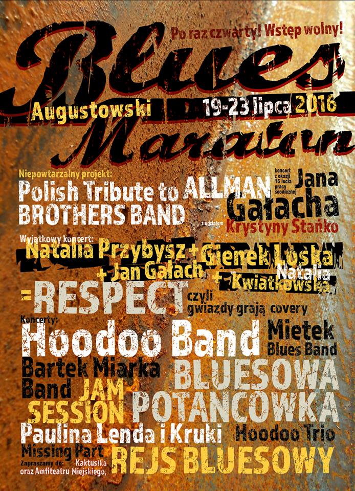 Ostatni dzień augustowskiego Blues Maratonu - sobota, 23 lipca - będzie składał się z dwóch części. Popołudniowy rejs statku po augustowskich jeziorach wypełnią akustyczne brzmienia. Bluesowe rejsy do tej pory cieszyły się dużym zainteresowaniem. Tym razem na pokładzie wystąpią Missing Part i Hoodoo. A w sobotni wieczór - wydarzenie bez precedensu w Augustowie. Będzie to koncert z okazji 15- lecia pracy scenicznej Jana Gałacha - Polish Tribute to The Allman Brothers Band. The Allman Brothers Band jest dla bluesa tym czym są The Beatles i The Rolling Stones dla rock and rolla. Zespół powstał w drugiej połowie lat '60-tych w USA i zdobył tam status grupy kultowej. Jan Gałach na swoje urodziny i do realizacji projektu zaprosił wybitnych solistów: Natalię Przybysz, Krystynę Stańko oraz Mariusza Korczyńskiego.