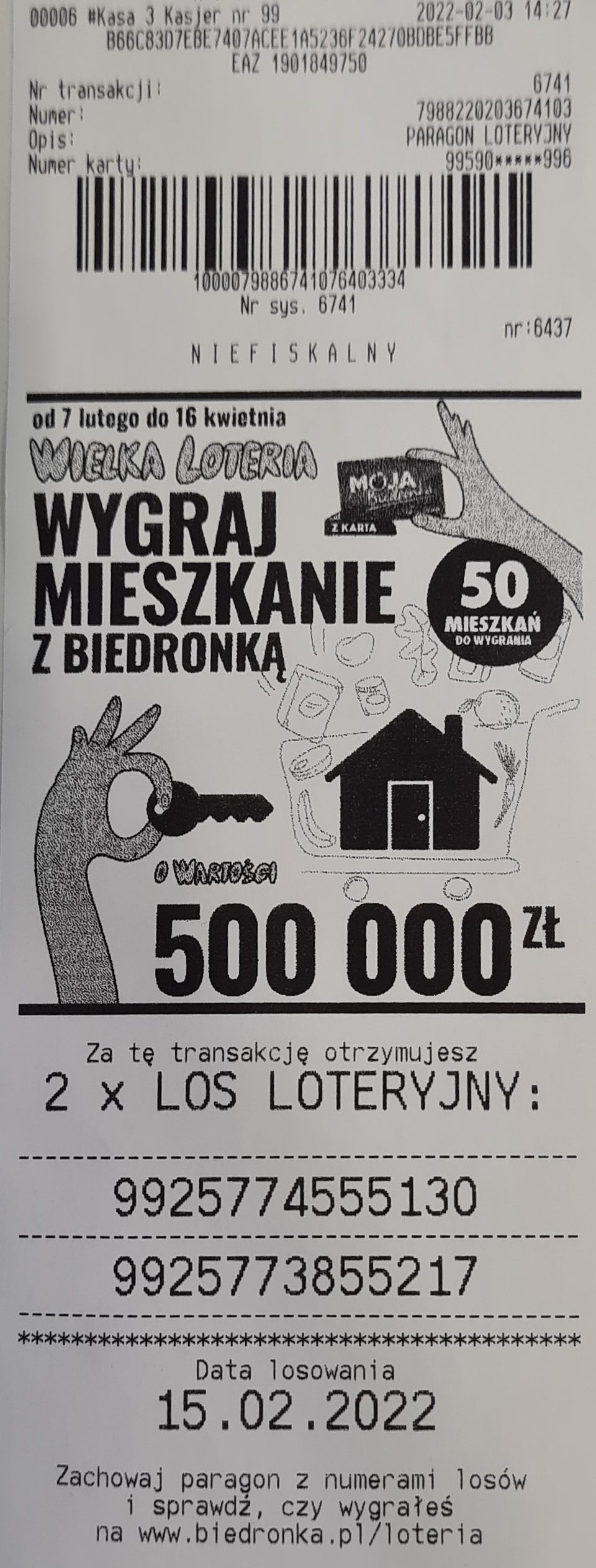 Od poniedziałku, 7 lutego br., Biedronka startuje z wielką loterią, w której pula nagród wynosi prawie 28 milionów złotych. 50 zwycięzców otrzyma po 500 tysięcy złotych na zakup mieszkania lub domu.