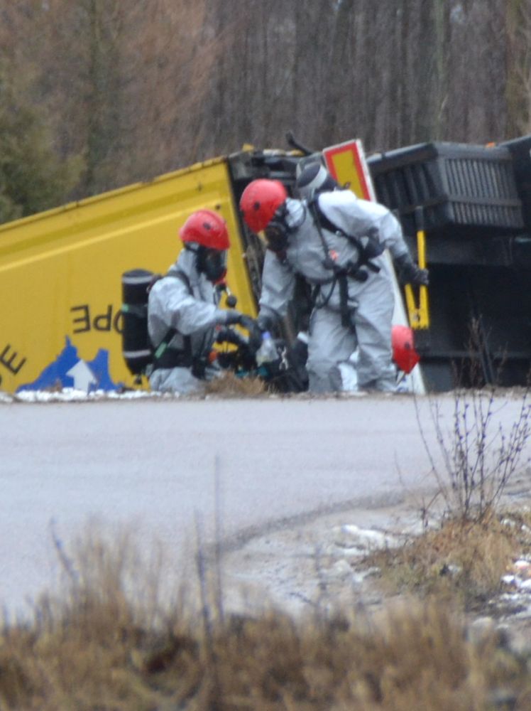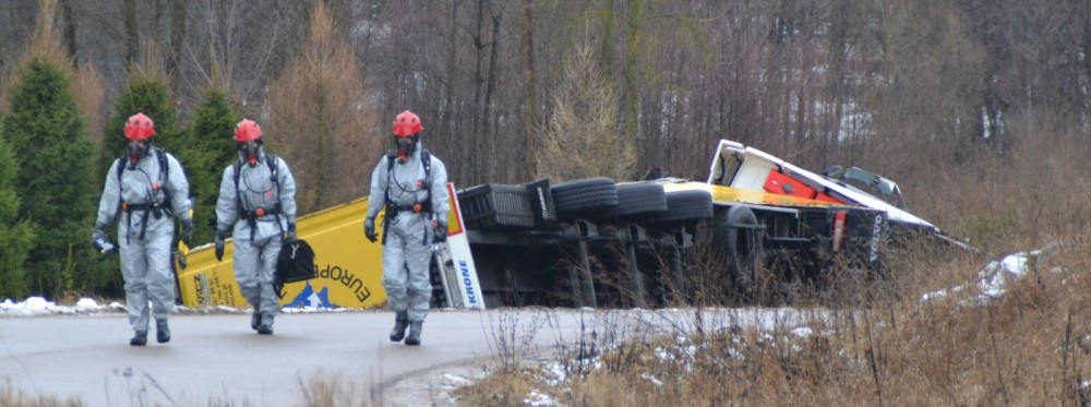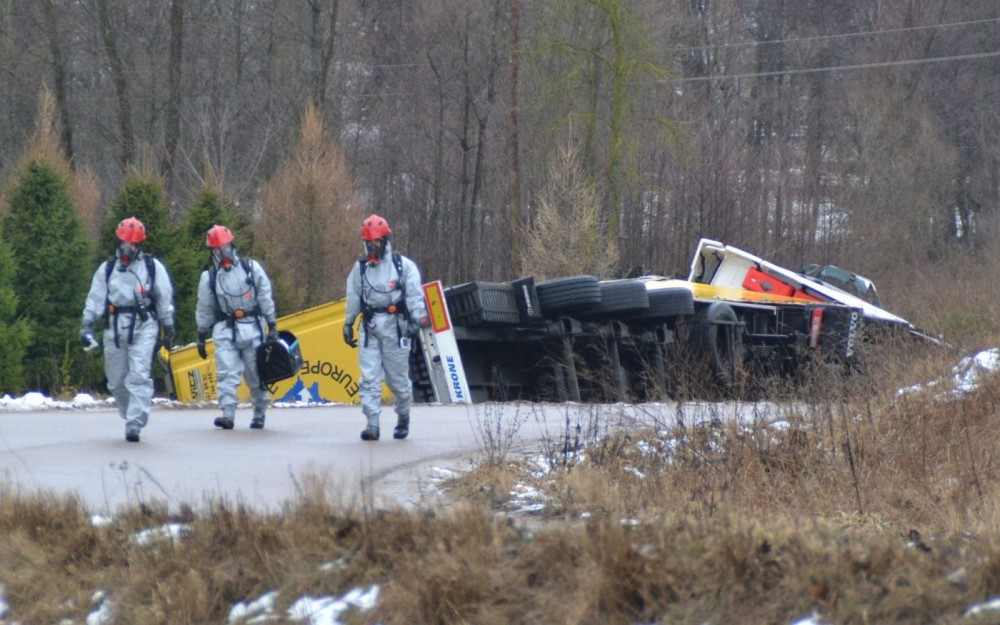 Specjalna ekipa chemiczna z Białegostoku oraz suwalscy strażacy pracują na miejscu wypadku w Brodzie Starym koło Suwałk. O 2.30 przewróciła się tam ciężarówka przewożąca chemikalia. Zbiorniki uległy rozszczelnieniu.
