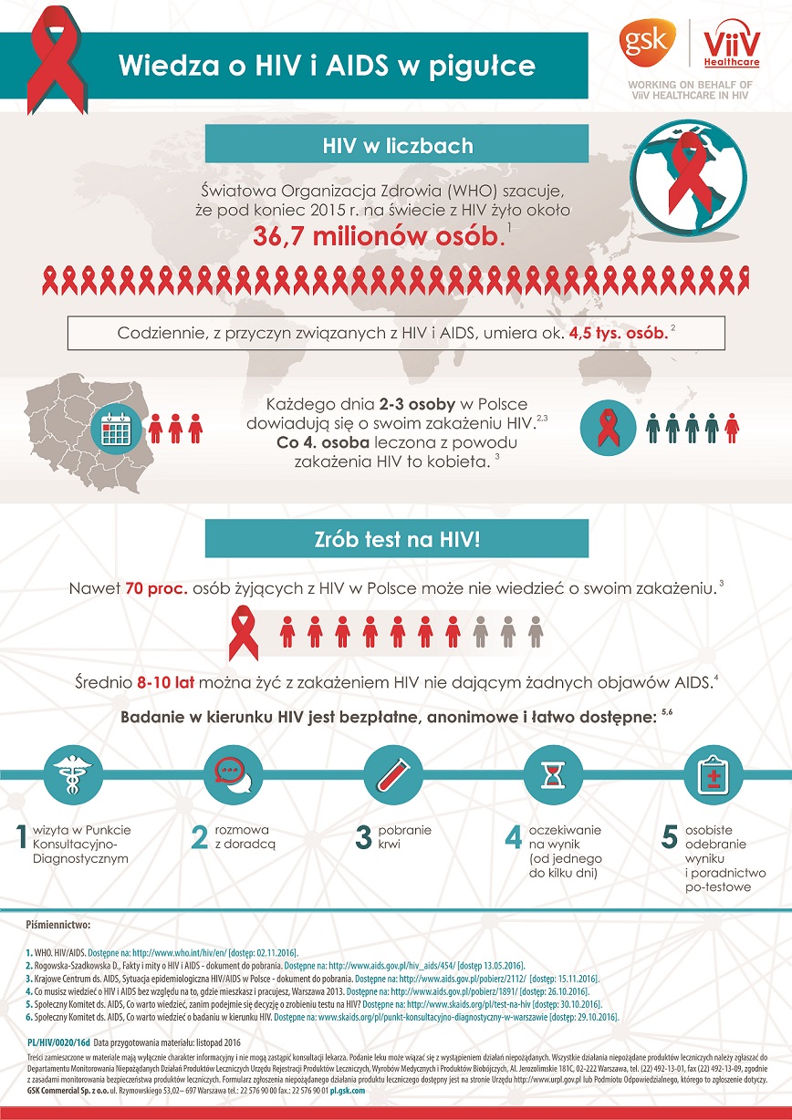 Liczba wykrytych zakażeń HIV w Polsce rośnie z każdym rokiem – Narodowy Instytut Zdrowia Publicznego - Państwowy Zakład Higieny (NIZP-PZH) w 2015 roku odnotował 1295 nowych zakażeń HIV, o 205 więcej niż w poprzednim roku.11 Każdego dnia 2-3 osoby w Polsce dowiadują się o swoim zakażeniu HIV, a co 5. osoba żyjąca z HIV to kobieta.12 Około 50 proc. wszystkich zakażeń HIV w Polsce dotyczy osób między 20. a 29. rokiem życia.1 Warto podkreślić, że nadal nawet 70 proc. osób żyjących z HIV w Polsce może nie wiedzieć o swoim zakażeniu.1 Co ciekawe, z zakażeniem HIV nie dającym objawów AIDS można żyć średnio 8-10 lat.1 W tym czasie wirus stopniowo niszczy układ immunologiczny (odpornościowy) osoby dotkniętej zakażeniem, może powodować rozwój zespołu różnych infekcji i nowotworów (chorób wskaźnikowych AIDS).5,9 Specjaliści z NIZP-PZH ustalili, że od wdrożenia badań w 1985 r. do 31 sierpnia 2016 r. (przy uwzględnieniu korekt i uaktualnień danych, w tym eliminacji podwójnie zarejestrowanych przypadków) stwierdzono zakażenie HIV u 20 756 osób zamieszkujących w Polsce.12 Wśród nich co najmniej 6187 osób zostało zakażonych w związku z używaniem narkotyków, 1512 osób poprzez kontakt heteroseksualny oraz 2889 osób poprzez kontakt seksualny pomiędzy mężczyznami. Łącznie odnotowano 3408 zachorowań na AIDS; 1348 chorych zmarło.12