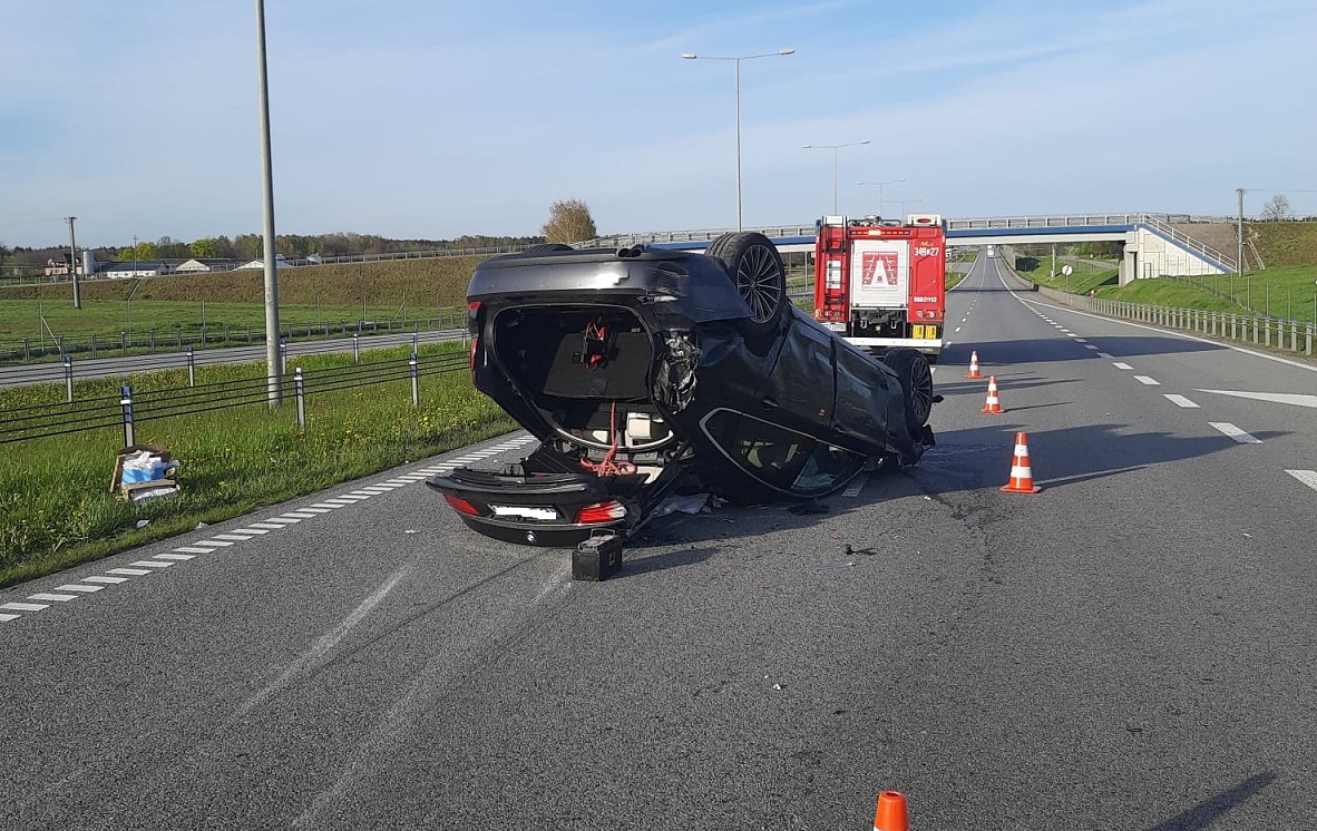 Wypadek drogowy w Koniecborze na drodze ekspresowej S – 61. Przed 18.00 w pobliżu stacji paliw Orlen doszło do dachowania BMW.