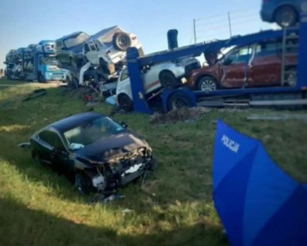 W stojące pojazdy uderzyła ciężarowa scania. Zepchnęła lawety oraz przewożone na nich samochody na pobocze, gdzie znajdowali się kierowcy lawet. Jeden z nich poniósł śmierć.