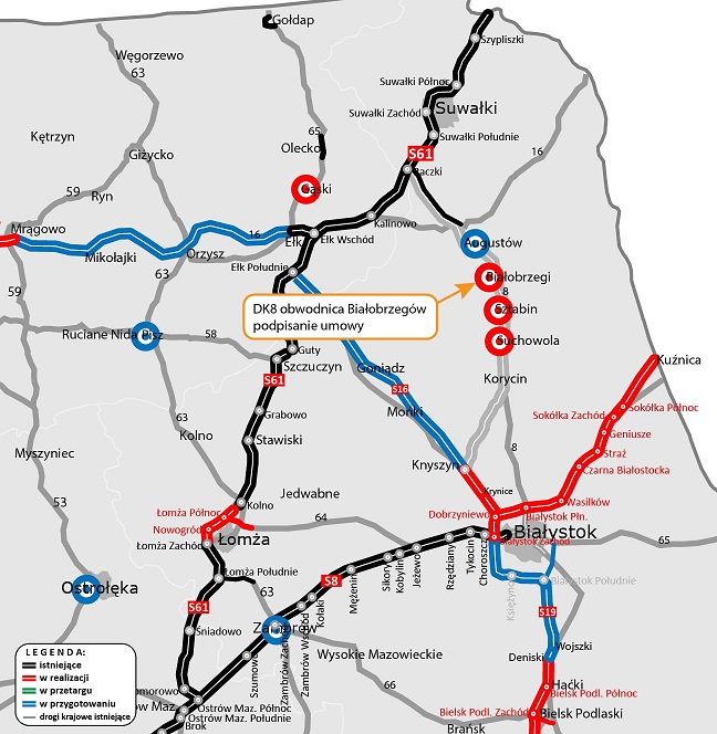 22 lutego br. złożono wniosek o decyzję środowiskową dla obwodnicy Augustowa w ciągu DK16, a obwodnica Zambrowa w ciągu DK63/66 jest na etapie prac przygotowawczych.